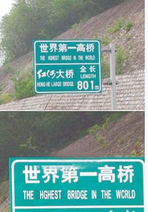 昨天中午,據博文深圳翻譯公司獲悉,線民“@攝影師-Alex”發微博稱:“堪稱“世界第一高橋”的紅河大橋(普洱元江)的路牌上竟然泛起了兩個錯誤的英文單詞(HIGHEST寫成HGHEST,WORLD寫成WCRLD)。”微博上貼出的圖片顯示,在一塊寫有“世界第一高橋”字樣的線路指示牌上,“高大”一詞的單詞“HIGHEST”被錯拼成了“HGHEST”,而“世界”一詞的單詞“WORLD”被錯拼成“WCRLD”。